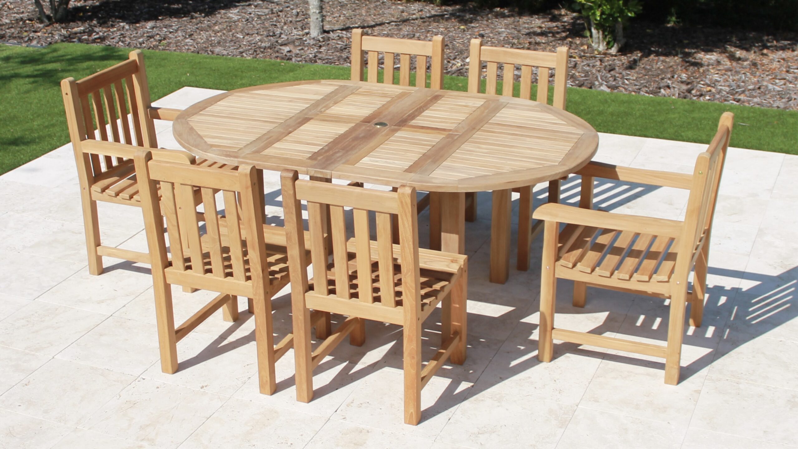 Teak 71in Round Extending Table & 6 Java Classic Chairs Set