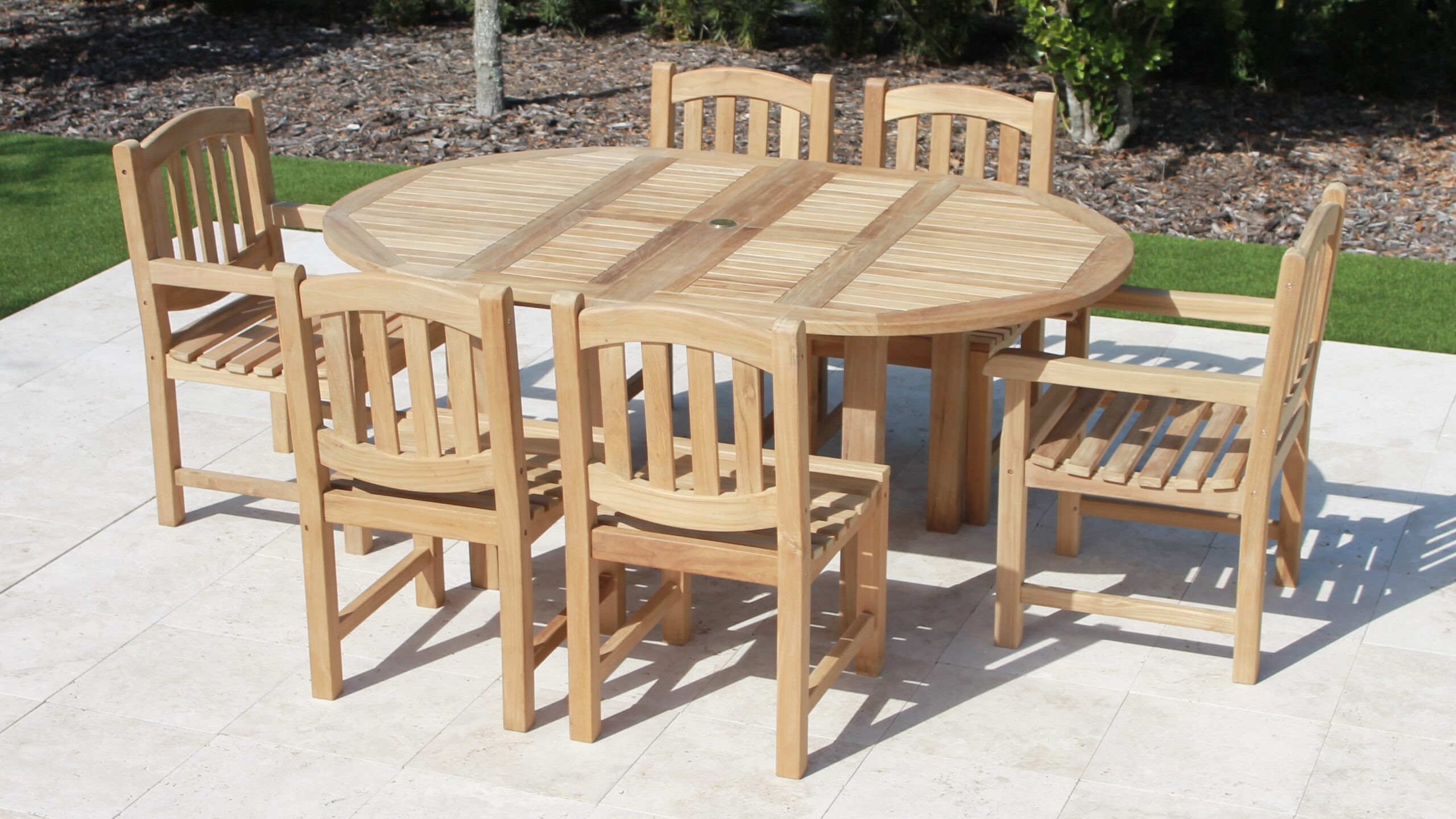 Teak 71in Round Extending Table & 6 Java Oval Chairs Set