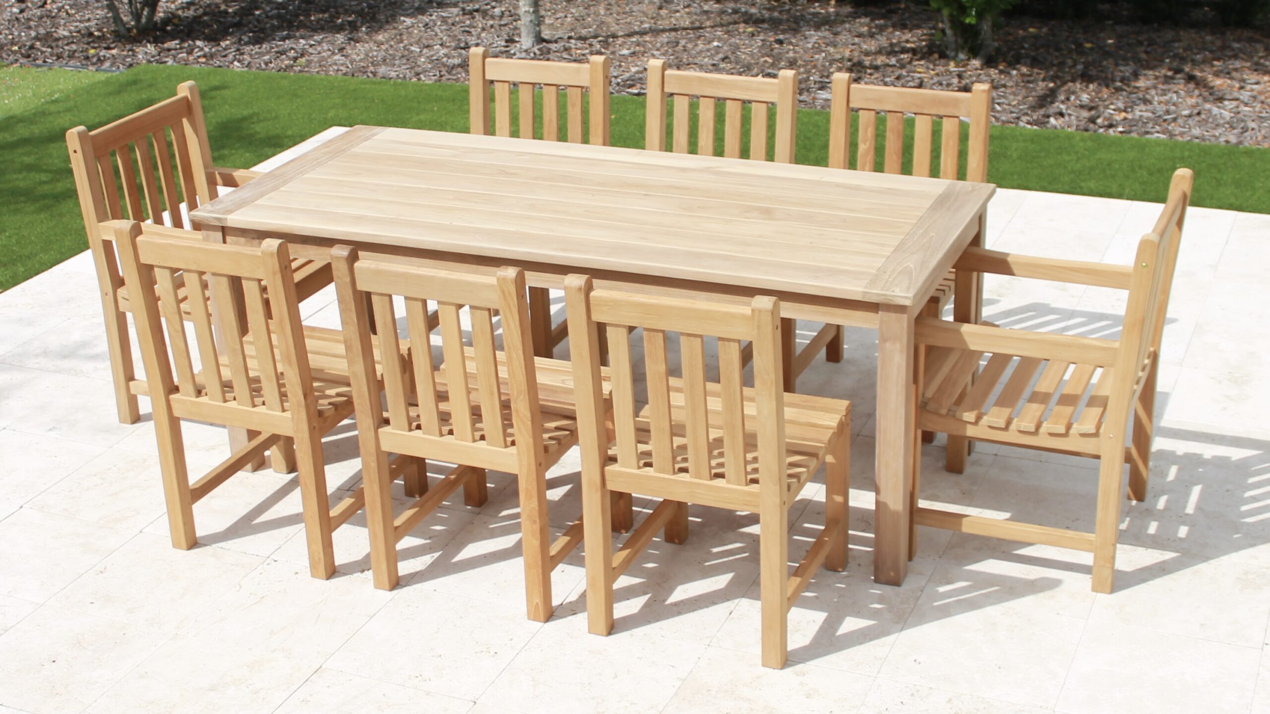 Solid Teak, 1in thick, Wide Table Top Slats complemented by 3in x 3in Extra Thick Solid Teak Legs – Each Leg weighing 8lbs makes for an extremely robust and heavy duty table.